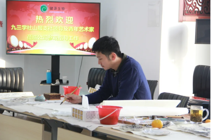 2020年11月6日,九三學(xué)社山東服裝學(xué)院支社侯家華主委攜泰安市青年藝術(shù)家們一行7人專程來到山東健源生物參觀指導(dǎo)、現(xiàn)場(chǎng)作畫,并傳授書畫藝術(shù)的精髓,弘揚(yáng)傳統(tǒng)文化。