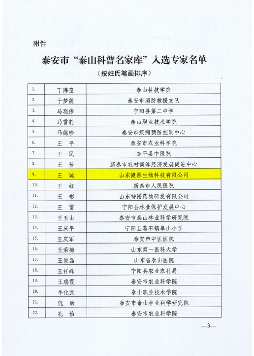 發(fā)布時(shí)間:[2024-6-6 16:33:30] 瀏覽量:2781次近日,泰安市科學(xué)技術(shù)協(xié)會公布了泰安市“泰山科普名家?guī)臁比脒x專家名單,根據(jù)泰安市“泰山科普名家?guī)臁比霂鞓?biāo)準(zhǔn),山東健源生物科技有限公司董事長王誠被認(rèn)定為泰安市“泰山科普名家”。
